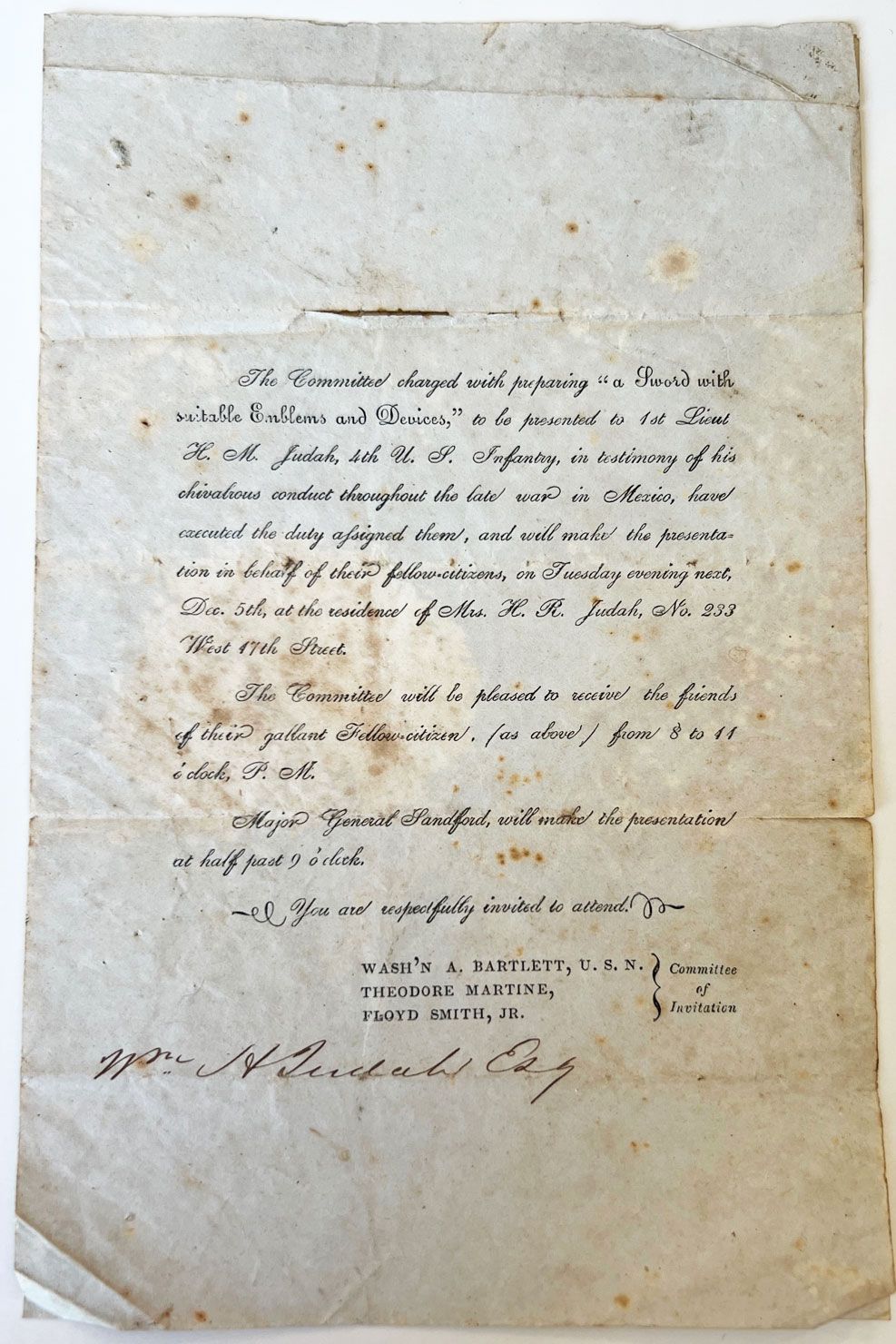 "On May 13, 1907, Henry Finkelstein, a pawnbroker, offered Gov. Edward C. Stokes of New Jersey a presentation sword he discovered in the garret of his Trenton, New Jersey, pawnshop when he purchased the building it was located in. The sword boasted a fine Damascus-steel blade, while the hilt, guard, and scabbard were crafted from coin silver. Engraved on the scabbard was the following inscription: “Presented to First Lieut. Henry M. Judah, 4th United States Infantry, for meritorious conduct and distinguished courage in the battles of Palo Alto, Resaca de la Palma, Monterey, Vera Cruz, Cerro Gordo, Churubusco, Molino del Rey and the City of Mexico by his friends and fellow-citizens of the city of New York.” Dr. Carlos E. Godfrey of the New Jersey Adjutant General’s Office was informed of Finkelstein’s discovery and attempted to track down Judah’s living descendants to return it to them.